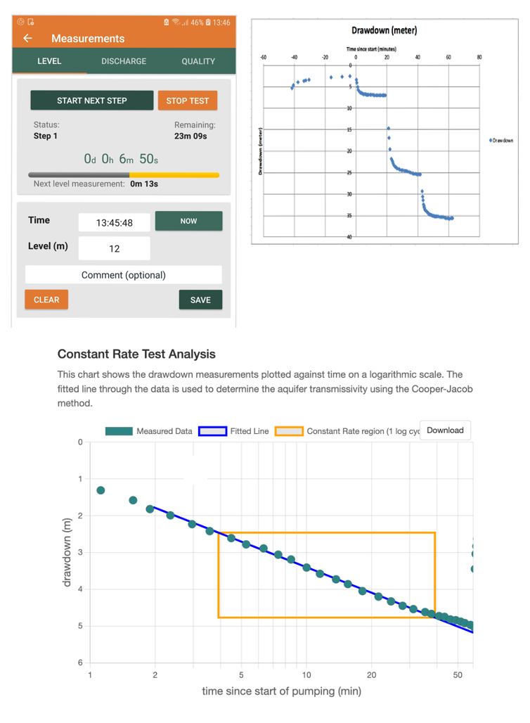 Perform a pump test and receive the data in Excel, including drawdown graphs. Analyse Constant rate, Recovery, and Step tests in the dashboard.
